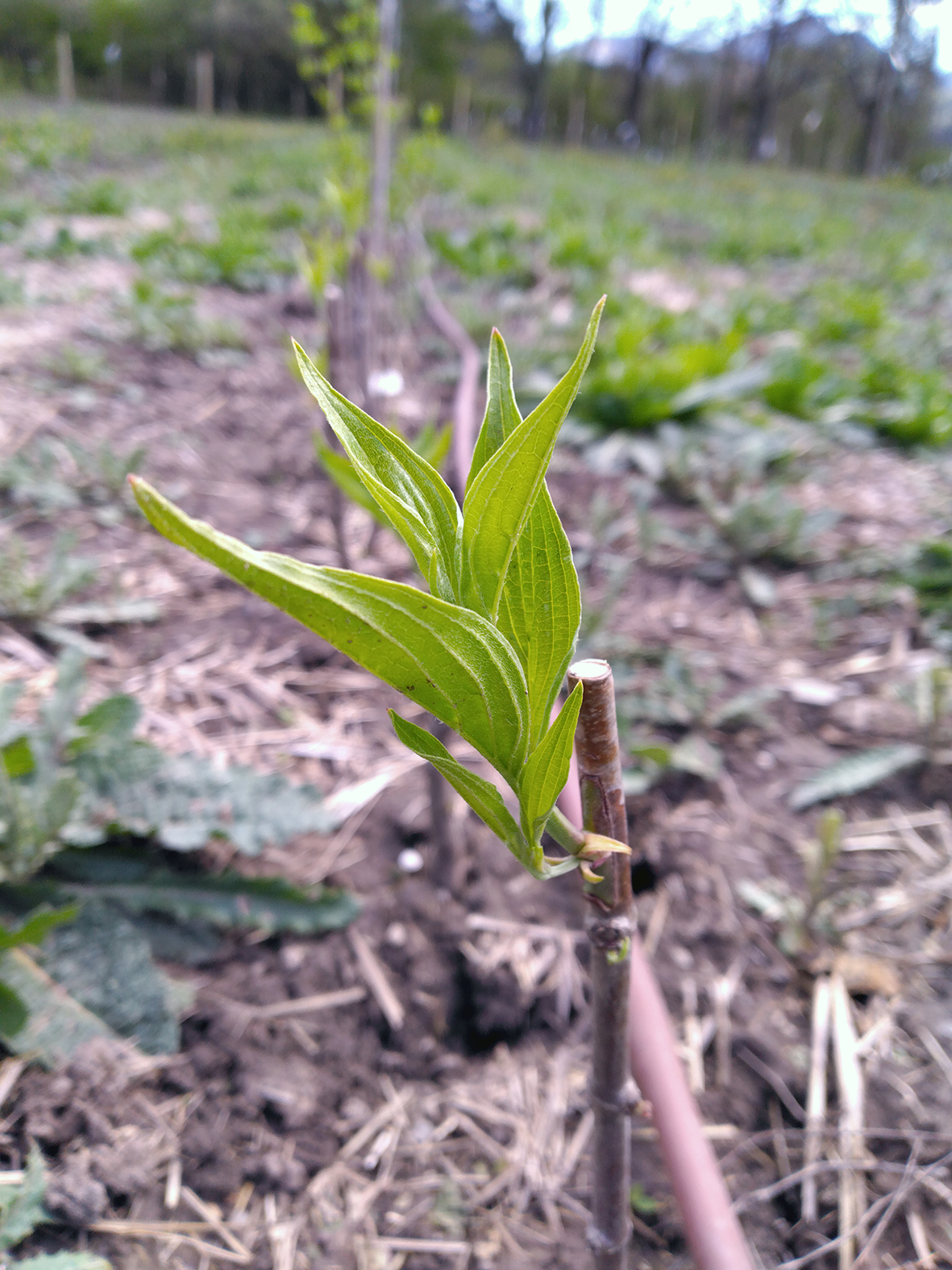 Les entre-rangs sont enherbés, plantes spontanées et semis de trèfle ou luzerne, et tondus pendant la saison. Cela permet de garder un sol couvert, l’humidité y reste plus longtemps, et les différents insectes auxiliaires y trouvent refuge.