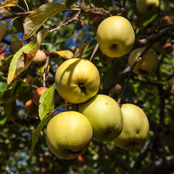 Une pomme si jolie, jaune en forme d’étoile à cinq branches, rosée sur la partie insolée. L’arbre est peu vigoureux, très élégant avec son port pleureur, ce qui en fait aussi un bel arbre d’ornement. La pomme est de petit calibre, à la peau fine, la chair est très blanche, craquante, bien juteuse, sucrée avec une pointe d’acidité.